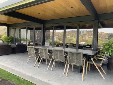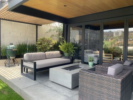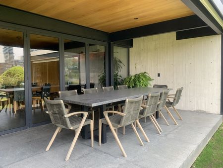 Sala y comedor con área de bar y salida a hermosa terraza equipada con fire pit, área de asador q se integra a bello jardín, el cual cuenta con riego por aspersión, así mismo área de salón de juegos con salida a jardín, medio baño de visitas y medio baño q da servicio a jardín.